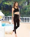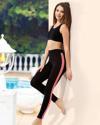 Pamuklu ve likralı kumaştan üretilmiş, yandan şeritli sporcu kadın tayt modelidir.