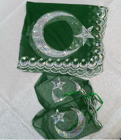 Yörük Tuhafiye Sermet Süs Dünyası Yeşil Damat Sağdıç Kına Omuz Örtüsü Şalı Eldivenli Pullu Ayyıldız Motifli .Kare Ölçülerde
