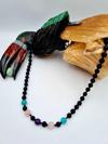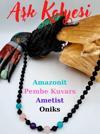 Amazonit, pembe kuvars ve ametist gibi değerli taşların birleşimiyle zenginleştirilmiş bu kolye, renkli ve göz alıcı bir estetik sergiler.