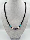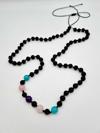 Pembe, mor ve siyah renk tonlarının uyumlu karışımıyla dikkat çeken bu kolye, her türlü kıyafetle kolayca kombinlenebilir.