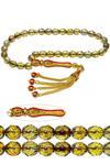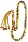 Yeşil renkli doğal fasetli kuvars taşı ve Sarı kırmızı mineli 24 ayar altın kaplama imame ve püskül seti kullanılmıştır. Çift kaplama atıldığı için renk atmaz ve kararmaz bir yapıya sahiptir. Yedek ip ile gönderim sağlanır. Üretildiği Taş.