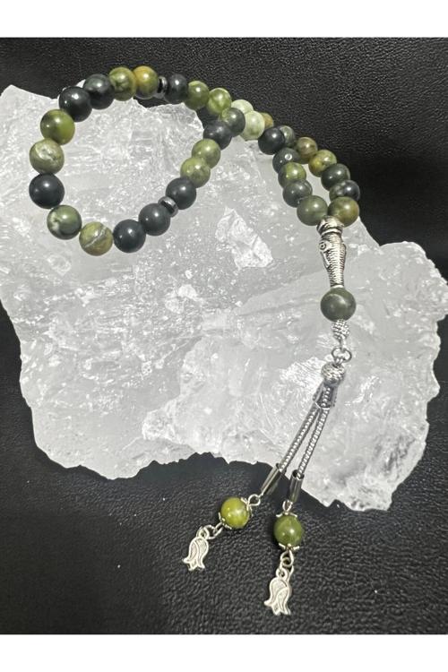 Doğal taş kullanımı sayesinde, her bir tesbih tanesi benzersiz ve eşsiz bir görünüme sahiptir; Sertifikalı serpantin doğal taş, kalite ve dayanıklılığı ile öne çıkar; AAA kalite standartlarına uygun olarak üretilmiştir, bu da uzun ömürlü kullanım vaat eder; Doğal taş materyali ile hem estetik hem de ruhani bir deneyim sunar;