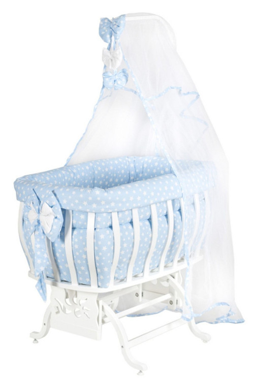 Mdf Beşik, Fiyonklu, Yıldızlı Sallanan Beşik Uyku Seti Cibinlik - Mavi