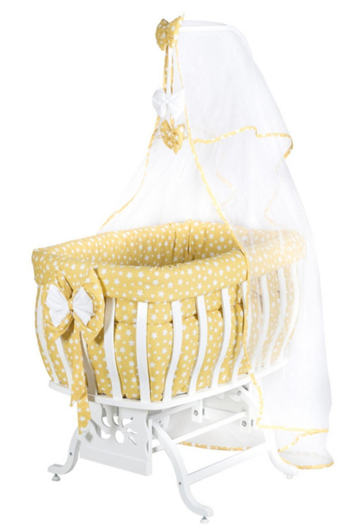 Mdf Beşik, Fiyonklu, Yıldızlı Sallanan Beşik Uyku Seti Cibinlik - Sarı