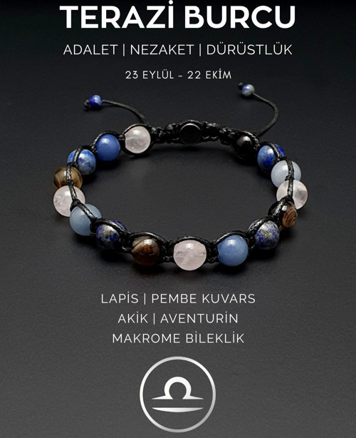 Seven Art Jewelry El Yapımı Terazi Burcu Makrome Bileklik – Lapis Lazuli, Pembe Kuvars, Akik ve Aventurin Taşlı