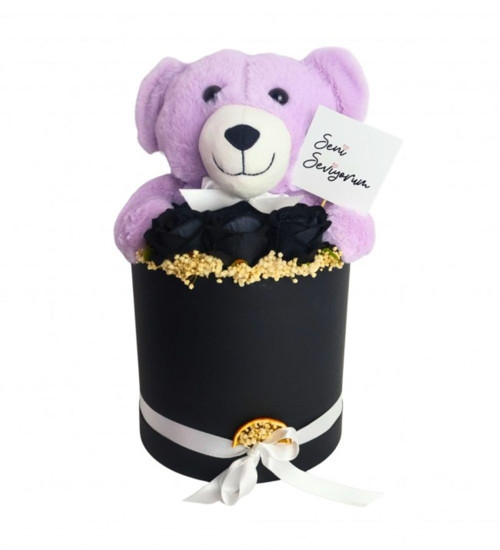 Ürün İsmi: Siyah Kutuda renkli Güller ve Mutlu Ayıcık