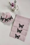 Havlu setimiz, pudra renkli havlu üzerine kelebek baskılı 3 adet konsept havludan oluşmaktadır.