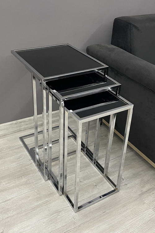 Sevinç Konsept 3'lü Krom Rengi Tekerlekli C Sehpa, SİYAH CAM, 6 mm Kalın Camlı, Çok Amaçlı Metal Zigon Sehpa