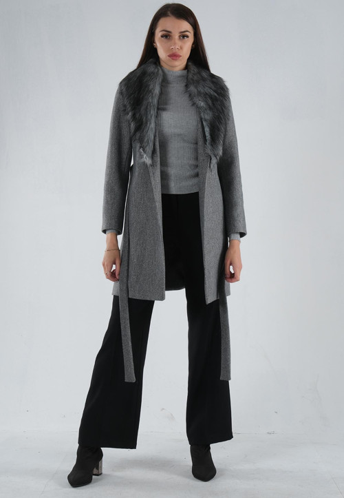 Uzun Kol Seyyar Kürklü Çift Cepli Kuşaklı Astarlı Düğmeli Kaşe Kaban