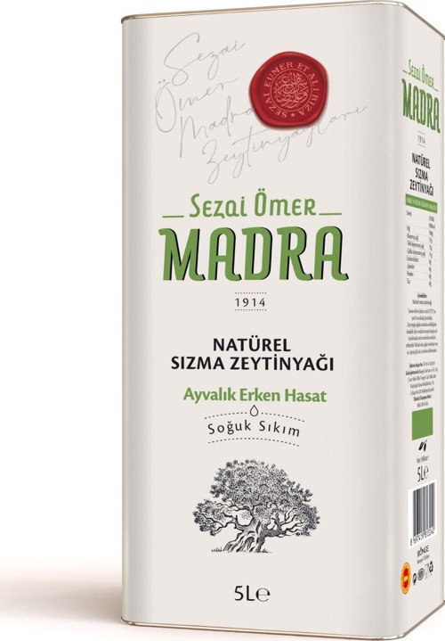 Sezai Ömer Madra 1914'ten gelen güçlü miras ve kalitesini günümüze taşıyor. Ayvalık’ın bereketli topraklarında, sezonun ilk hasat döneminde özenle toplanan zeytinlerden soğuk sıkım yöntemi ile elde edilen Erken Hasat Natürel Sızma Zeytinyağı, yoğun meyvemsi aroma, dengeli acılık ve hafif yakıcılığa sahiptir.