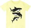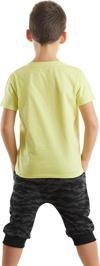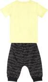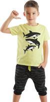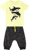 2 parça erkek takım. Pamuklu penye kumaştan, sarı t-shirt. Üzeri köpekbalığı baskılı. Düşük ağ kesimli, pamuklu kumaştan, kamuflaj baskılı, kapri boy pantolon. İki yan ceplidir. Beli lastik ve kordonludur. Tüm MSHB&G ürünleri çocuk güvenlik kurallarına uygun olarak üretilmekte ve iğne dedektörlerinden geçmektedir.