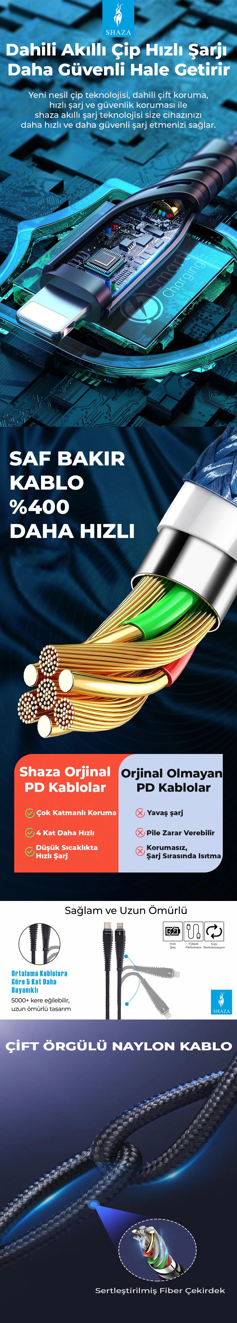 - Shaza Şarj Kablosu aşırı akım, aşırı voltaj, aşırı şarj, aşırı deşarj, aşırı ısınma, kısa devre ve elektromanyetik alan korumaları ile cihazınıza zarar gelmesini engeller, Type-C girişli mobil cihazlar için güvenli ve hızlı şarj sunar.