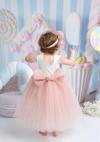 Beyaz Pudra Fiyonklu Tül Doğum Günü Elbisesi ve Pon Pon Bandana Takım, Çocuk Abiye Elbise Şık Tasarım: Etek bölümünde arkada 3 kat, ön tarafta ise 2 kat pudra renkli tül kullanılmıştır. Toplamda 5 parça tül, eteğe hareketli ve şık bir görünüm kazandırmaktadır.