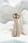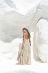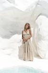İnce askılı ve sık büzgü detaylı V uzun yaka elbise. Astarlı.
