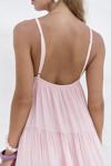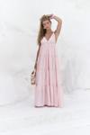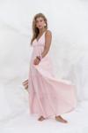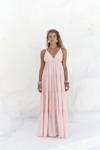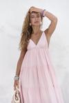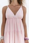 İnce askılı ve sık büzgü detaylı V uzun yaka elbise. Astarlı.