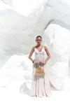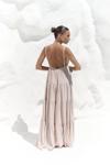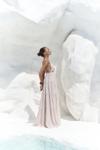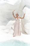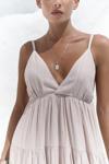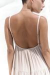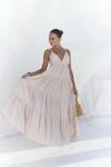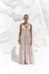 İnce askılı ve sık büzgü detaylı V uzun yaka elbise. Astarlı.