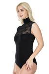 Balıkçı yaka sıfır kol, yaka kısımları tamamen dantelli kadın body modelidir.
