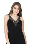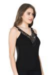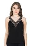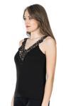 Sıfır kol ve V Yaka tasarıma sahip, dantel detaylarıyla estetik bir görünüm kazandıran kadın atlet modelidir.