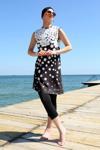 Plajda ve havuzda şıklığı ve rahatlığı bir arada arayan kadınlar için Çamaşır Kenti'nin Sıfır Kol Puanlı Yarım Tesettür Mayo tercih edilebilir.