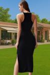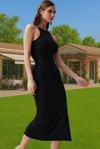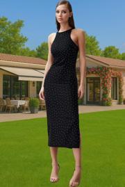 Bu göz alıcı elbiseyle her ortamda ışıldayın! Parlak taşlarla süslü dokuma kumaşı, vücudunuzu sararak zarif bir siluet oluşturur. Midi boy kesimiyle hem şık hem de rahat bir kullanım sunarken, halter yakası modern ve sofistike bir görünüm kazandırır. Özel günlerinizin yıldızı olmak için mükemmel bir seçim.