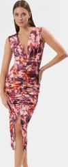 Polyester ve Elastan karışımı kumaş, esnek yapısı ve nefes alabilir özelliği ile gün boyu rahatlık sağlar. V yaka detayı, boynunuzu ve omuzlarınızı zarif bir şekilde ortaya koyarken, büzgü detayı belinizi ince göstererek vücut hatlarınızı ön plana çıkarır. 120 cm uzunluğundaki midi boyu, her mevsim ve her ortama uyum sağlayan şıklığıyla dikkat çeker. Elbisenin astarsız yapısı, hafif ve serin bir kullanım sunar. Makinede kolayca yıkayabileceğiniz bu elbise, uzun süreli kullanım için idealdir.