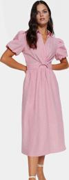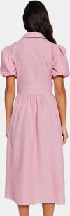 Dokuma kumaşın kalitesi ve dayanıklılığı, uzun süreli kullanım imkanı sunarken, kısa ve balon kollu tasarımıyla hem şık hem de hareket özgürlüğü sağlıyor. Elbisenin çizgili deseni, zamansız bir şıklık sunarken, pembe rengi yazın enerjisini yansıtıyor. Eteğinin belden açılan özelliği ise elbiseye özgün bir tarz katıyor.