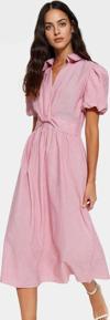 Yaz aylarında hem şık hem de rahat olmak isteyenler için ideal olan bu pembe çizgili midi elbise, dokusuyla ve tasarım detaylarıyla öne çıkıyor. Nefes alabilen %100 pamuklu dokuma kumaşı gün boyu konfor sunarken, skater kalıbı ve gömlek yakasıyla modern bir tarz yakalamanızı sağlıyor. Belden düğümlü detayı ise hem şık bir görünüm kazandırıyor hem de vücut hatlarınıza zarif bir şekilde uyum sağlıyor.