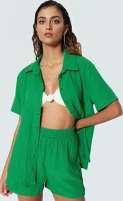 Yeşil dokuma gömlek şort takımımız 36-44 beden aralığında mevcuttur. Her vücut tipine uyum sağlayan kalıbıyla, kendinizi özgür ve güvende hissedeceksiniz. Şortun uzun boyu sayesinde bacak boyunuza uygun bir görünüm yakalarsınız. Plajda, havuz başında, günlük hayatta veya gece dışarı çıkarken rahatlıkla kullanabilirsiniz. Hem şık hem de rahat bir görünüm için idealdir.