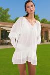 Bu şık ve rahat mini elbise, yaz aylarında plajda veya günlük hayatta kullanabileceğiniz mükemmel bir seçenek. Hafif ve nefes alabilen pamuklu viskoz kumaştan üretilmiş olan elbise, hem şık hem de konforlu bir deneyim sunar. Bisiklet yakası ve uzun kolları ile zarif bir görünüm sergilerken, volan detaylı tasarımı ile feminen bir hava katıyor.