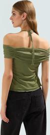Bu sezonun gözdesi Haki Örme Bluz ile stilinize modern bir dokunuş katın! Carmen yakası ve kısa kollarıyla yaz aylarında serin ve şık kalmanızı sağlar. Nefes alan örme kumaştan üretilen bu bluz, gün boyu konfor sunarken, vücuda oturan kalıbıyla da zarif bir görünüm yaratır. Bağlama detayı ise bluza özgün bir stil kazandırır. Astarlı yapısı sayesinde iç göstermez ve gün boyu rahatlık sağlar.