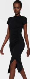 Pamuklu kumaşı sayesinde tene temasının konforu ve nefes alabilirliği ile gün boyu kendinizi rahat hissedeceksiniz. Bodycon kalıp rahat olmasına rağmen vücuda tam oturur ve şekillendirme özelliği sayesinde kusursuz bir siluet oluşturur. Büzgü detayı ise elbiseye dinamik ve modern bir görünüm kazandırıyor. Yan yırtmaç sayesinde hareket özgürlüğünüz kısıtlanmazken, şık bir görünüm elde etmenizi sağlar. Makinede yıkanabilir özelliği sayesinde de bakımı oldukça kolaydır.