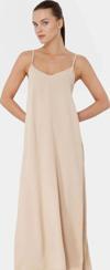 Polyester kumaşın dayanıklılığı ve kolay bakımı sayesinde, bu elbiseyi uzun yıllar boyunca gönül rahatlığıyla kullanabilirsiniz. Nefes alabilir yapısı, gün boyu serin ve ferah kalmanızı sağlar. Shift kalıp, vücudunuza mükemmel otururken, zarif V yakası da görünümünüze sofistike bir hava katar. Kolsuz tasarımı, sıcak yaz günlerinde serin kalmanız için idealdir. Maxi boyu ise hem şık hem de rahat bir görünüm sunar.