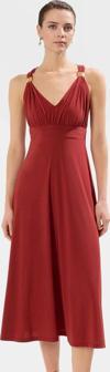 Zarif ve modern tasarımıyla dikkat çeken bu midi elbise, günlük yaşamınızda şıklıktan ödün vermeden rahatlığı hissetmenizi sağlayacak. V yakası ve aksesuar detaylarıyla feminen bir görünüm sunarken, örme kumaşıyla gün boyu konforu garanti eder. Hem iş hem de günlük kombinlerinizde kolayca kullanabileceğiniz bu elbise, gardırobunuzun vazgeçilmez parçalarından biri olacak.