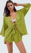 Yüksek kaliteli viskoz ve pamuk karışımı kumaş, yumuşak dokusu ve nefes alabilir özelliği ile gün boyu konfor sağlar. Truvakar kol detayı, sıcak yaz günlerinde serin kalmanıza yardımcı olurken, V yakası zarif ve şık bir görünüm sunar. Bluzun bağlamalı ön detayı ise, görünümünüze kişisel bir dokunuş katmanızı sağlar. Şortun mini boyu ve rahat kalıbı, hareket özgürlüğünüzü kısıtlamaz.