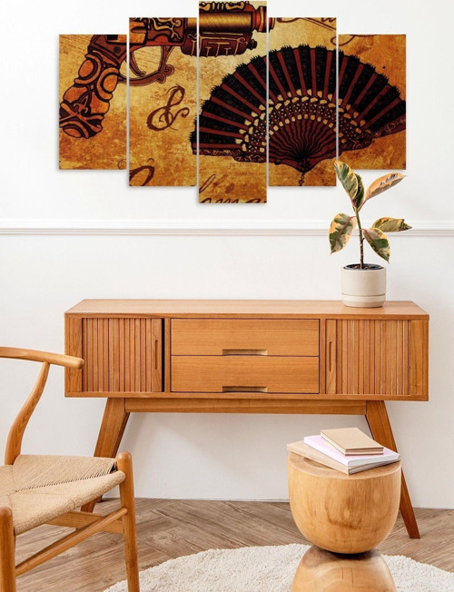 Modern tasarımı ile evinizin dekorasyonunu tamamlayan silah ve yelpaze temalı mdf tablo, her oda için ideal bir sanat eseri.; Yüksek kaliteli ahşap malzeme kullanılarak üretilmiş olup uzun ömürlü kullanım sunar.; Beş parçadan oluşan bu set, silah ve yelpaze temalı sanat eserleriyle dikkat çekerken modern dekorasyon anlayışını da yansıtır.; Hem fonksiyonel hem de estetik açıdan zenginleştirilmiş bu tablo, yaşam alanlarınıza sanatsal dokunuşlar katmak isteyenler için mükemmel bir seçimdir.;