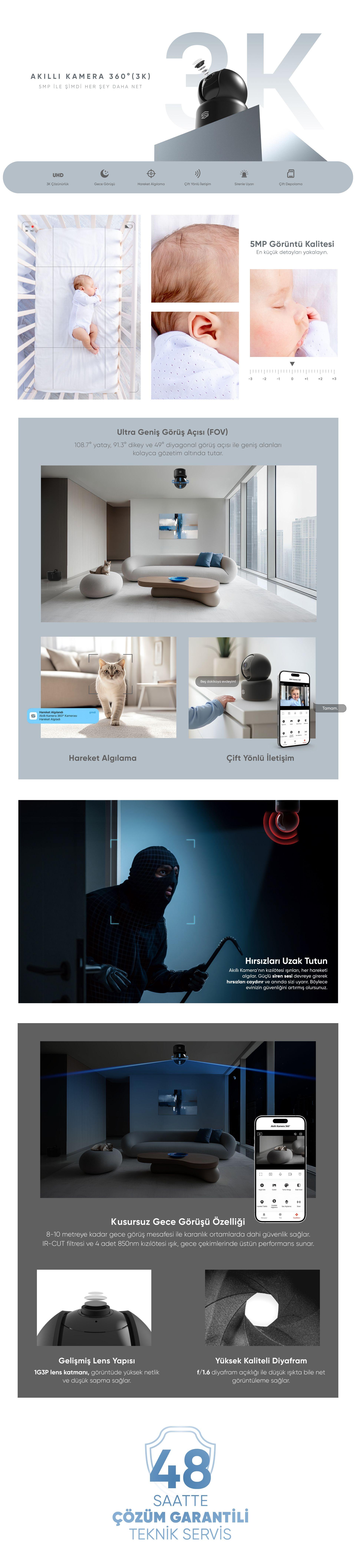 Konumlandırılan alanda eşzamanlı olarak etrafındaki her yönü görüntüler, hareket algılanması durumunda kullanıcıya Şımart uygulaması üzerinden bildirim gönderir.