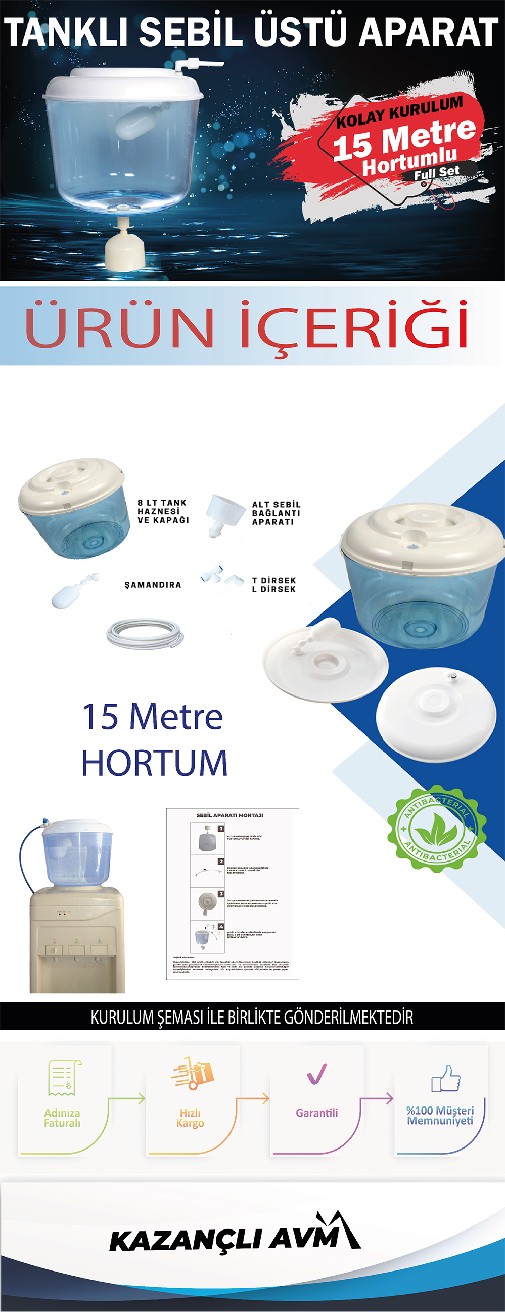 8 litre hazneli model sebil aparatı Ürün kutusu içindeki malzemeler: 1-8 litre kapasiteli şeffaf fanus 2-Fanus kapağı 3-Hortum bağlantı dirseği "l" fitting 4-Hat almak için "t" fitting 5- Alt şamandıra 6 -üst şamandıra 7- 15 mt 6 mm bağlantı hortumu 8- Ara vana
