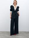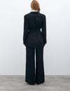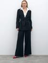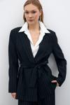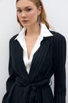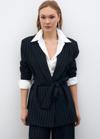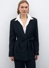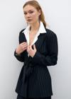 Kruvaze yaka, ön tek düğmeli, uzun normal kol, kalça altı boy, kuşaklı, sim çizgili ceket.