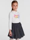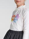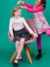 Bej Örme Kumaştan Tasarlanmış Kız Çocuk Blüzün Göğsünde Baskı Vardır. Yakası Esnek Ve Fırfırlıdır. Takımın Eteği İse Simli Kumaştandır Ve Örmedir. Rahat Kalıp Beli Lastikli Eteğin Astarı Yoktur