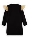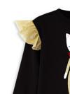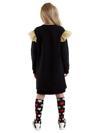 Kalın, %100 pamuklu kumaştan kız çocuk siyah elbise. Uzun kollu, sıfır yaka, dizüstü boy. Omuzlarda simli kumaştan fırfır detayı vardır. Altın rengi sim ile kedi deseni baskılıdır. Tüm Denokids ürünleri çocuk güvenliği düşünülerek üretilmiştir ve iğne dedektörlerinden geçirilmiştir.
