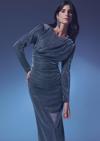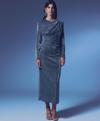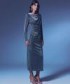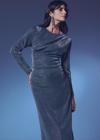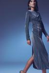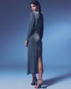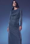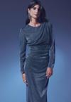 Bisiklet yaka, uzun ve düz kol, arka yırtmaçlı, iç astarlı, büzgü detaylı, simli midi elbise.