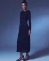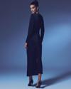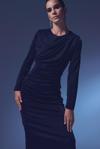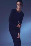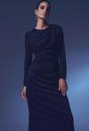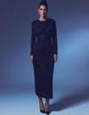Bisiklet yaka, uzun ve düz kol, arka yırtmaçlı, iç astarlı, büzgü detaylı, simli midi elbise.