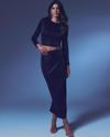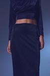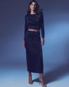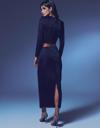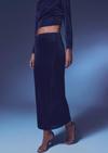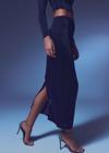 Yüksek ve hafif lastikli bel, arka fermuarlı, iç astarlı, arka yırtmaçlı, esnek, simli midi etek.