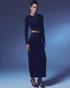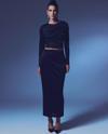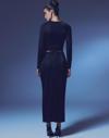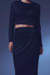 Yüksek ve hafif lastikli bel, arka fermuarlı, iç astarlı, arka yırtmaçlı, esnek, simli midi etek.