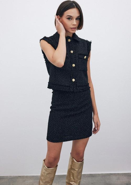 Yüksek bel, arka fermuarlı, iç astarlı, simli mini tüvit etek.