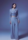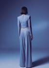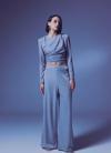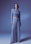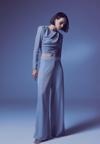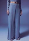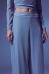 Yüksek bel, yan fermuarlı, astarlı, esnek, simli salaş pantolon.