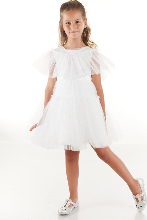 Bisiklet yakalı ve kolsuz abiye elbise. Yaka detayına dikilen üst tül, kola ve üst gövdeye farklı bir görünüm katmıştır. Tülün altındaki üst gövde simli kumaş görünümlüdür. Eteği kabarık tüllüdür. Arkasındaki gizli fermuarı sayesinde kolayca giyilip çıkarılabilir. Arka belinde fiyonk detayı bulunmaktadır. Astarlıdır. Bu elbise, kızınızın düğünlerde vazgeçilmezi olacak.