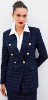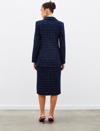 Kruvaze yaka, vatkalı, uzun kol, iç astarlı, kapaklı süs cep, desenli gol düğmeli, simli uzun ceket.