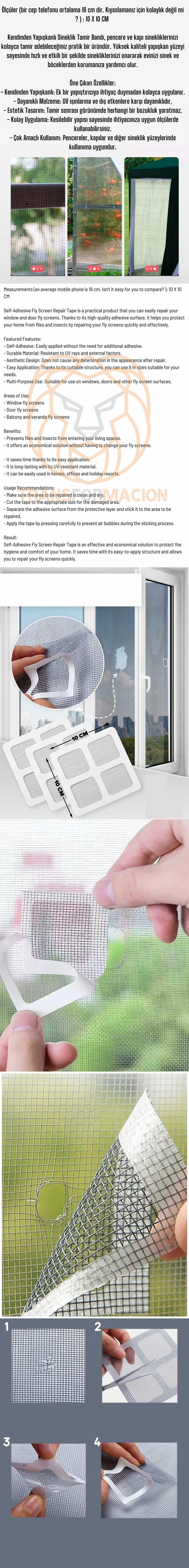 Kendinden Yapışkanlı Sineklik Tamir Bandı, pencere ve kapı sinekliklerinizi kolayca tamir edebileceğiniz pratik bir üründür. Yüksek kaliteli yapışkan yüzeyi sayesinde hızlı ve etkili bir şekilde sinekliklerinizi onararak evinizi sinek ve böceklerden korumanıza yardımcı olur.
