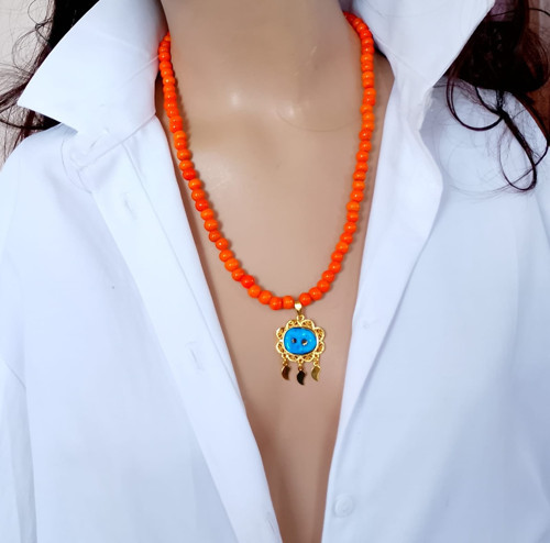El yapımı turuncu cam boncuklar ve iki gözlü telkari Süryani nazar taşı ile tasarlanan bu özel kolye, enerjik rengi ve güçlü sembolizmiyle stilinize anlam katıyor.